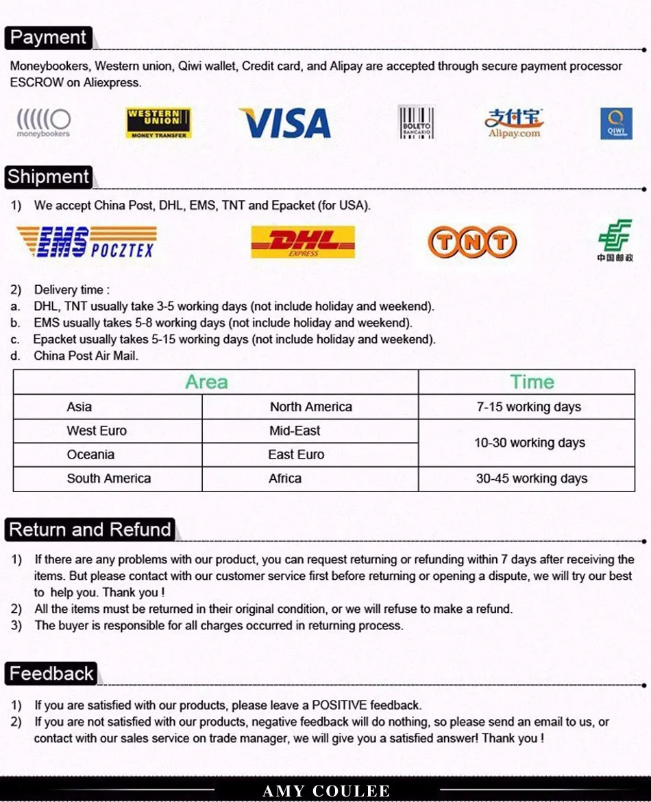 Your satisfaction and positive feedback is very important to us. Please leave positive feedback and 5 stars if you are satisfied with our items and services. If you have any problems with our items or services, Please feel free to contact us first before you leave negative feedback. We will do our best to solve any problems and provide you with the best customer services.