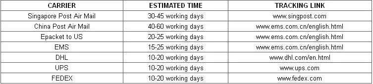We usually provide FREE SHIPPING via Singapore/China Post Air Mail and Epacket which normally takes 45-60/20-25 working days for delivery. Shipping by EMS, DHL,UPS or FEEDEX are also availabe if you wish to pay extra charge or your order reach a large amount. You can contact me first by trade manger or sending messages, and then I can change the price for you with knowing the quantity you need. When I know it, I will contact you ASAP.