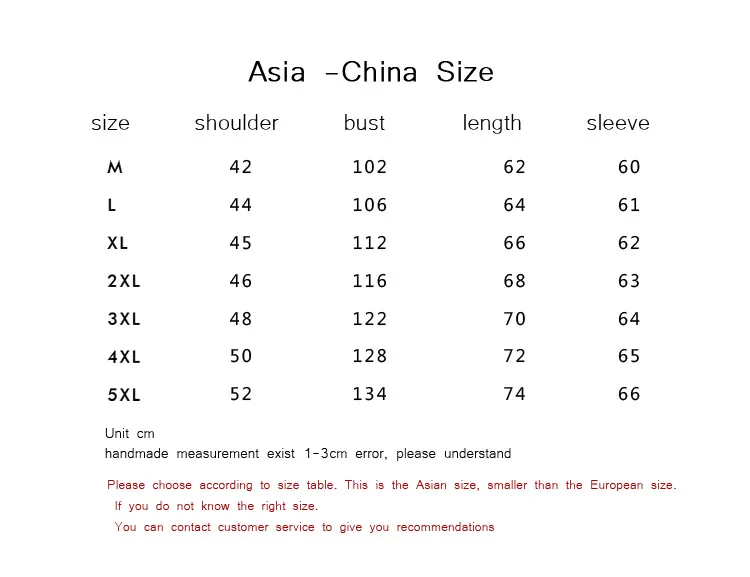 All the products in the store are Asian size. Asian size is smaller than European size. Please choose according to the size table. If you can not determine the size, please contact customer service. If you are satisfied with our products. Please give us 5 stars. If you receive a product do not like it. You can contact customer service. We can discuss the way to deal with. Mode of transport China Post Registered Air Mail 7-30 days, Epacket 7-30 days. AliExpress Standard Shipping 7-30 days. EMS 3-15 days DHL 3-10 days Postal aging is unstable, and sometimes there will be a package backlog. Causing the transport time to be too long. Please understand! If you need other modes of transport. You can contact customer service