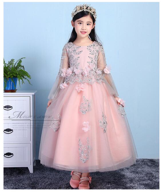 Girls Pageant Long Formal Dresses 2020 Long Sleeve Gauze Ball Gowns Flowers Girls Princess Tutu Dress Kids Party Wedding Dresses